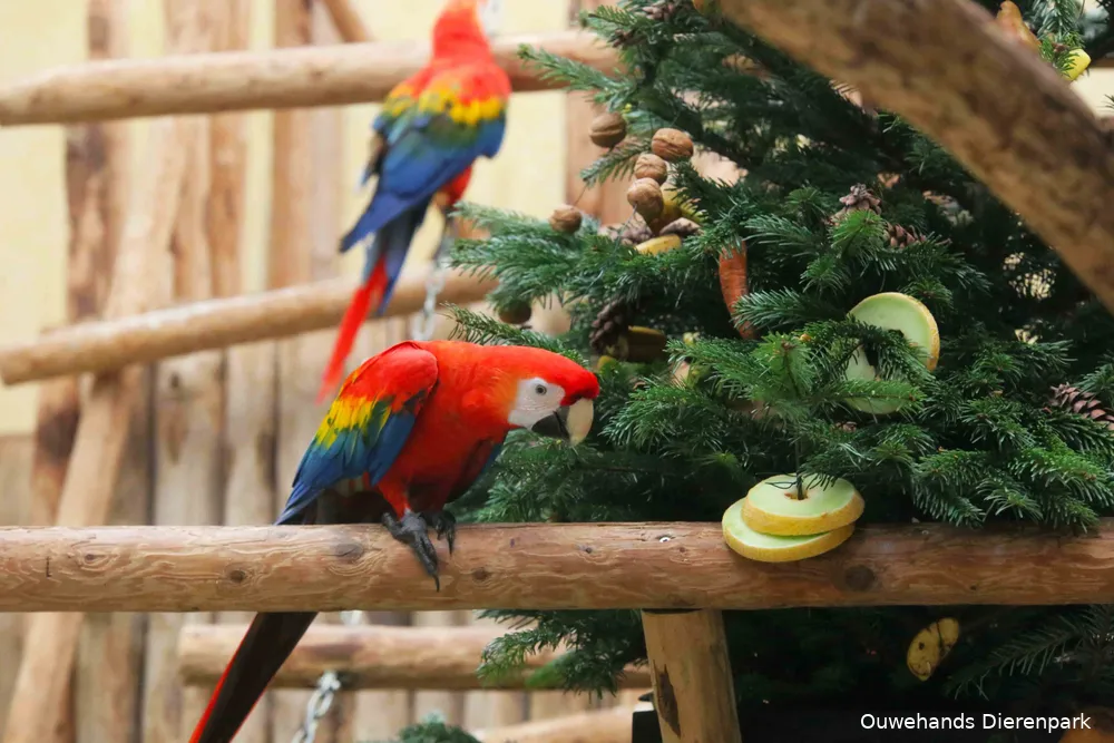 Ook bij de ara’s viel hun winterse traktatie, bestaand uit meloen, appel, winterpeen en walnoten in de smaak.