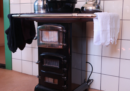wasketel op de kachel in de keuken. Net als het andere kleine wasgoed,