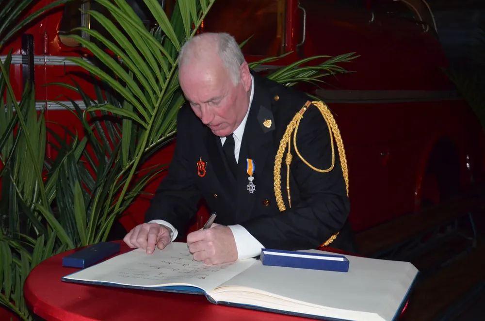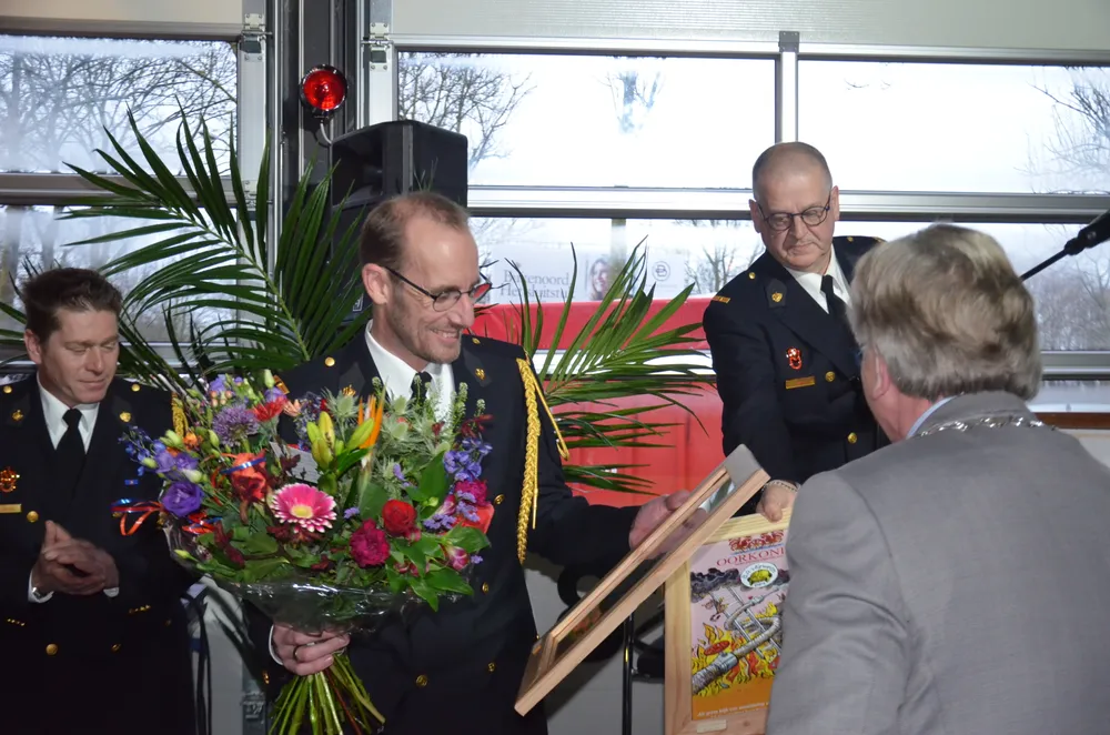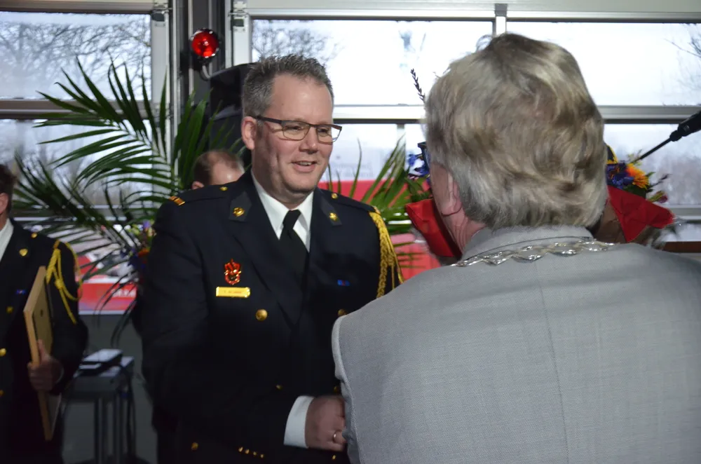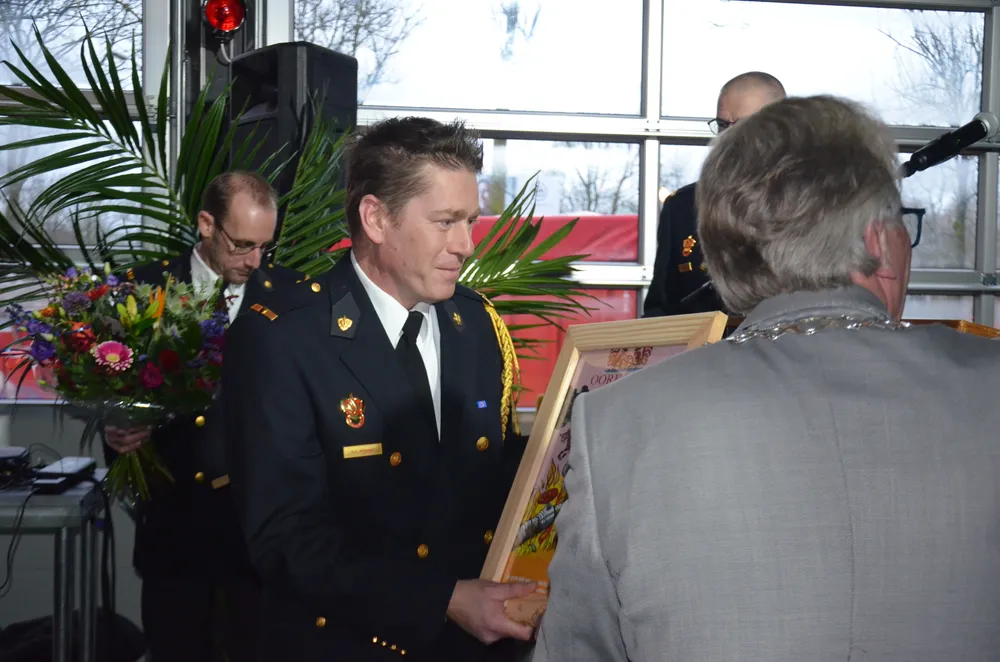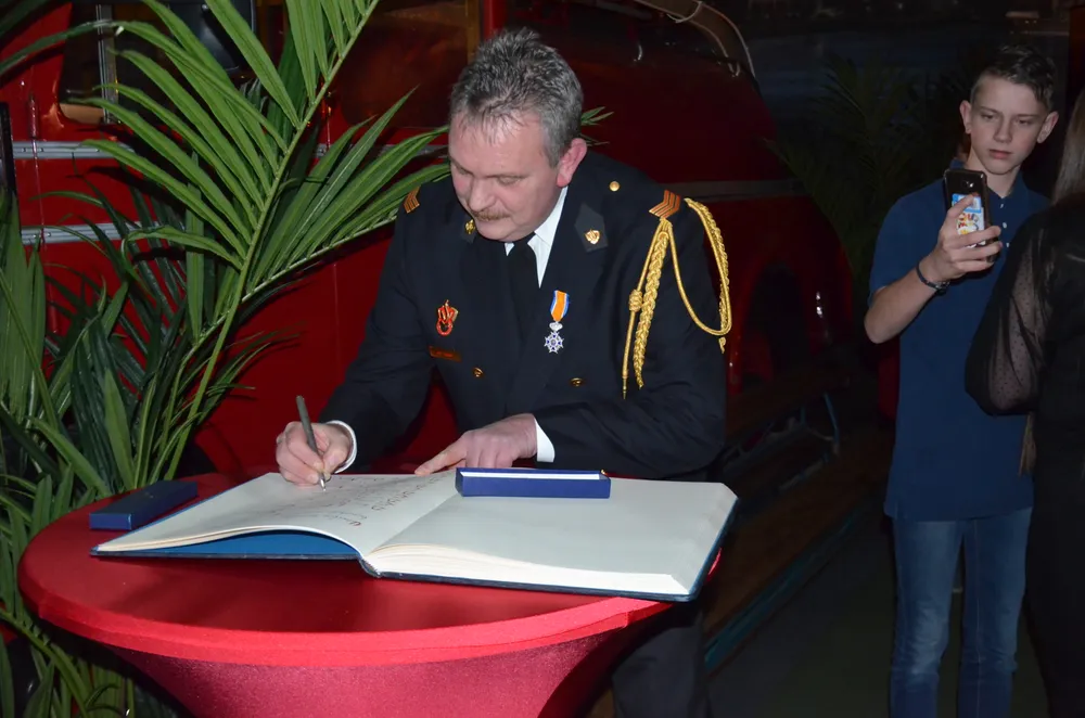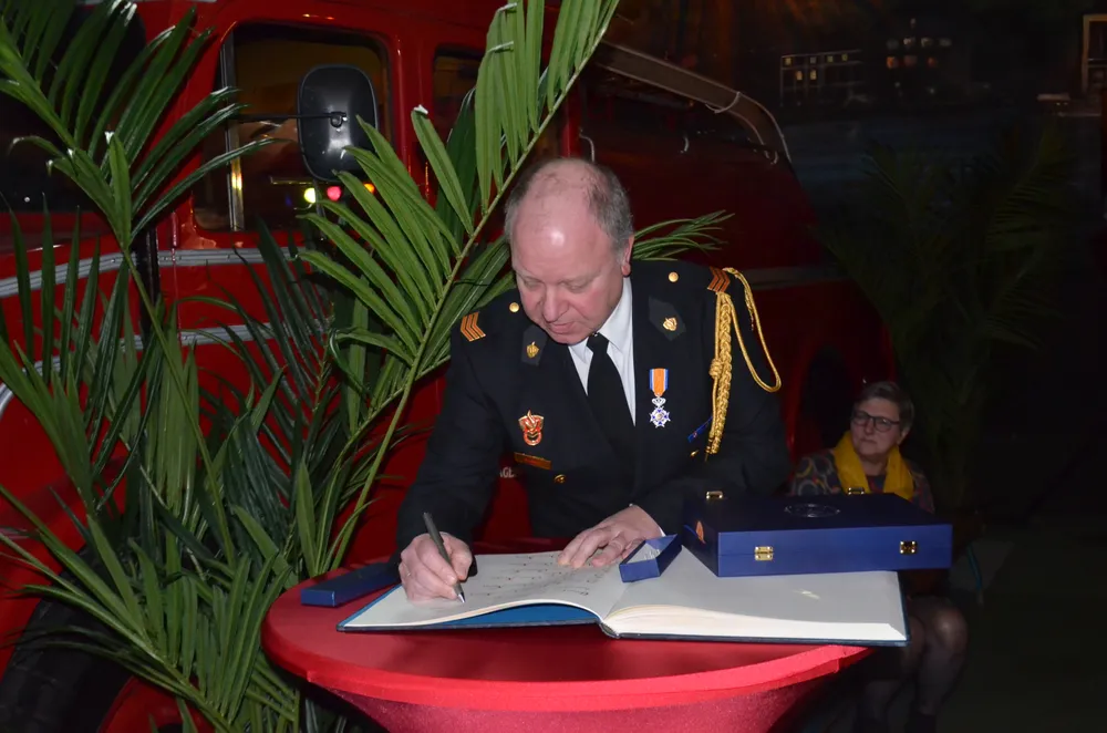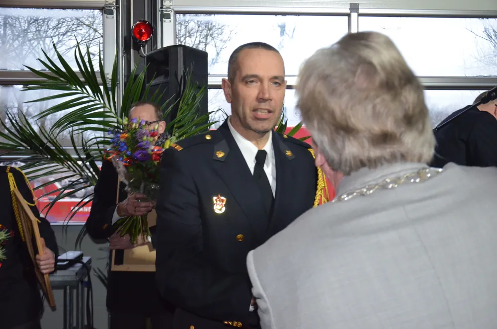 De halve brandweerkazerne aan de Marijkeweg was vanavond even omgetoverd tot een feestruimte, het materieel op de parkeerplaats, behalve natuurlijk de oude, prachtige brandweerwagen. Daar had toch niemand meer op gereden die er vanavond is, dacht de burgemeester maar hij vergiste zich, daar gingen toch een paar handen van wat oud-gedienden omhoog, zeker wel!