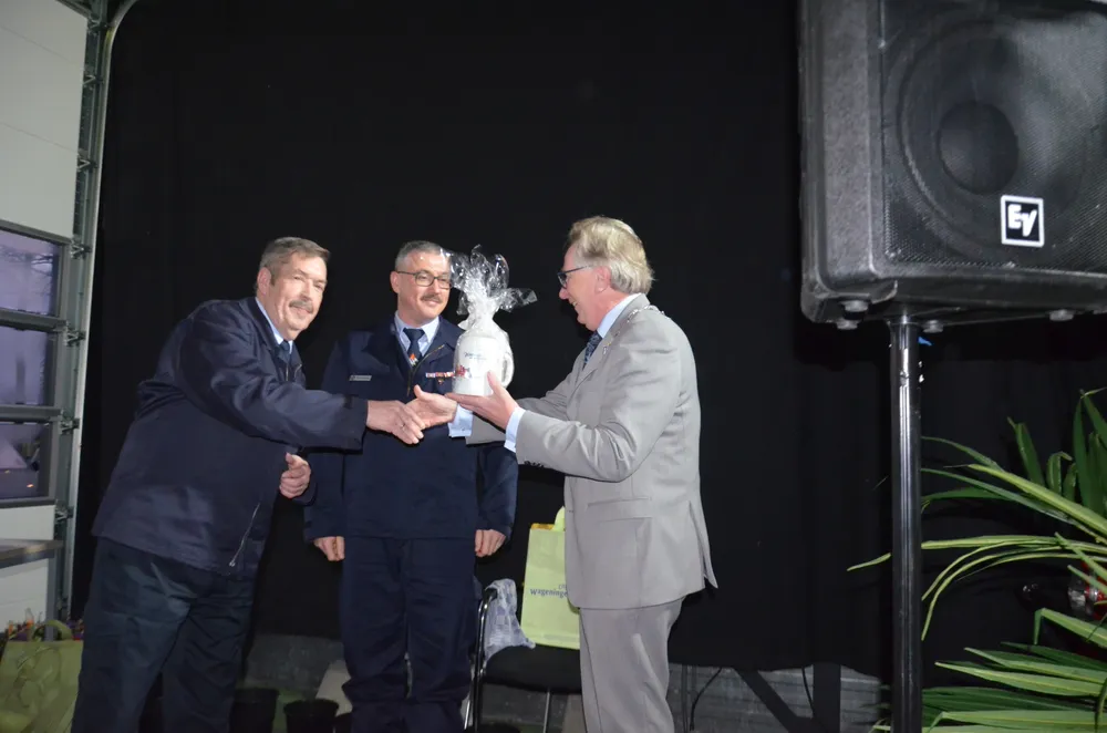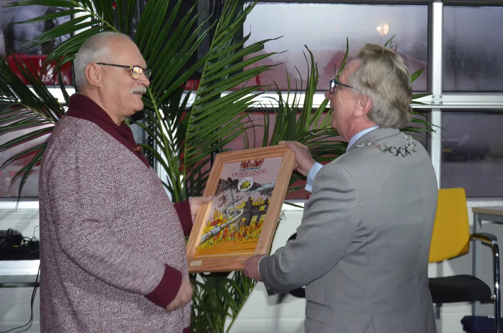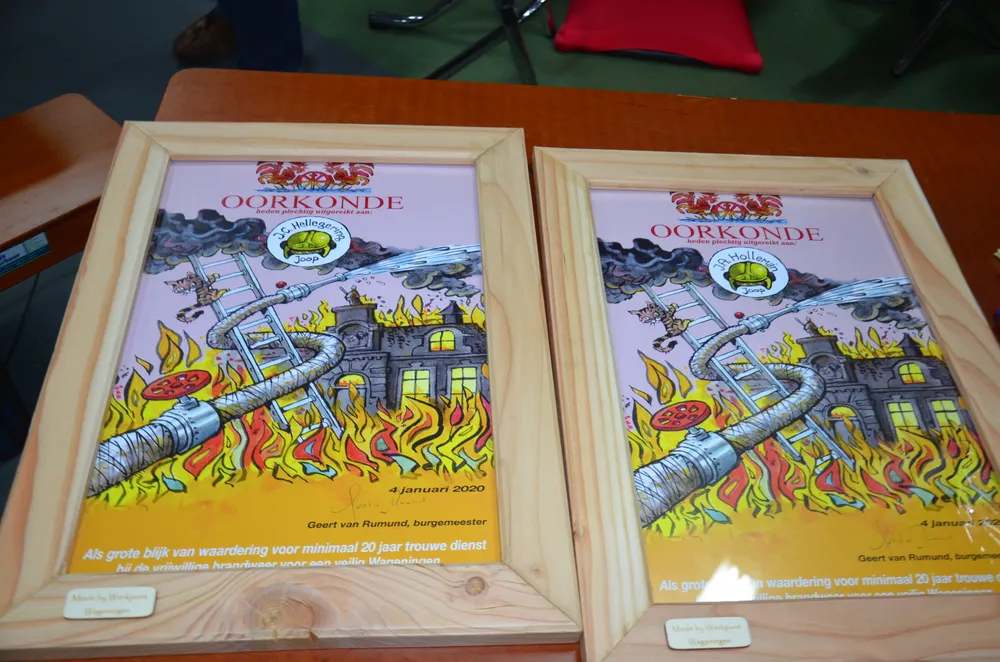 Alfred Engert van de Duitse brandweer in Bürstadt was op uitnodiging ook aanwezig. Hij was zeer vereerd er vanavond bij te zijn. Hij had voor de burgemeester een presentje meegenomen. Burgemeester van Rumund kon hem daarop verrassen met ook een oorkonde om de vriendschapsband die er tussen Wageningen en Bürstadt is te onderstrepen. Die komt vast trots op de Duitse kazerne te hangen.