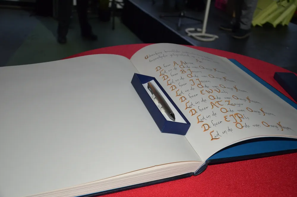 De nieuwe leden in de Orde werden allemaal gevraagd het Wagenings Gedenkboek te tekenen.